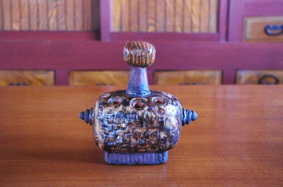 いかにも手作りのごつごつとした粗削りな風合いとユニークな表情とフォルム、暗褐色の釉薬がとても印象的なフィギュアです。胴体の部分には花が生けられるようにいくつか穴が開けられています。ここに可愛らしいお花を一輪ずつ生けて飾ったら、優しげなお顔の表情とマッチして、静かで温かい世界がそこに広がりそうです。