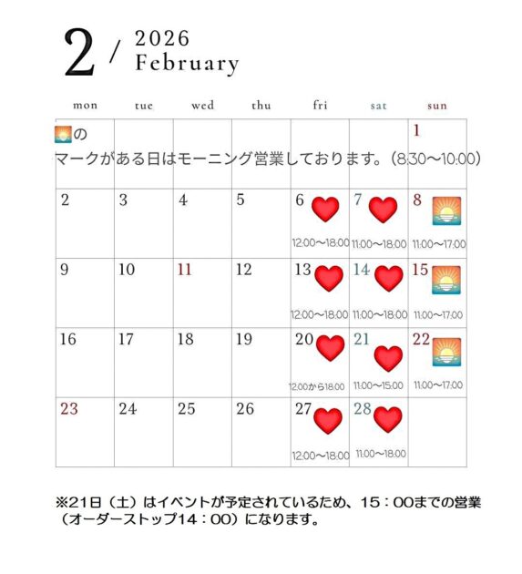 2月の営業予定をお知らせします。まず今週末、1月30日(金)~2月1日(日)の三日間は1月の営業予定でお知らせしたようにお休みを頂いています。申し訳ありません。また、2月21日(土)はイベントが予定されているため営業終了時間が15:00迄(オーダーストップは14:00になります)となっていますのでご注意くださいませ。