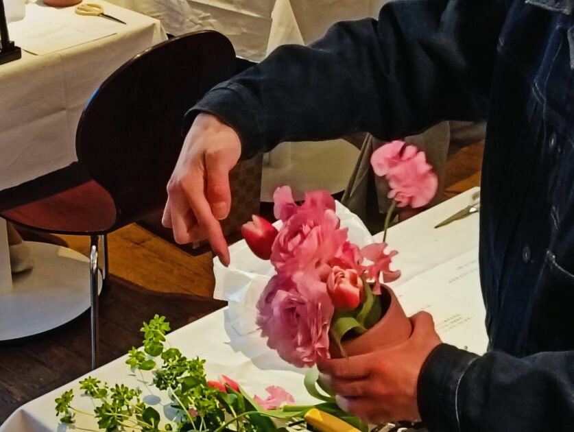 ポイントが説明されると、いよいよお客様の実践の時間。でもポイントがわかっていても、いざ自分でやるとなると手がとまってしまいます。どこで切るのがベストなのか、どの位置にどの角度で挿せばよいのか、迷えばきりがありません。そんな時に秋田さんが各席を回りながら絶妙なアドバイスをしていきます。お一人お一人の作品を見ながら、その作品に合った提案をしていきます。