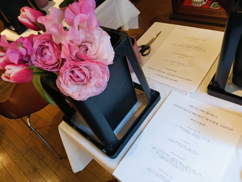 今回ご用意いただいたお花は「春を楽しむ」というテーマから、チューリップ、スイトピー、ラナンキュラス、そしてププレリュームの4種類。春らしいピンク色を基調に選ばれたお花の特徴や花言葉の紹介と「アレンジメント作成の基本」を表したパンフレットもご用意され、秋田さんの優しく軽やかな語りでワークショップは進められました。