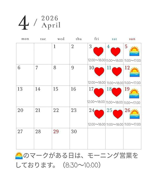 さて、4月の営業予定をお知らせします。今月は特にイベントもなく、粛々と「金・土・日」の営業となります。下旬にはゴールデンウィークに入りますが、規則正しく「金・土・日」営業になりますので、よろしくお願いを致します。